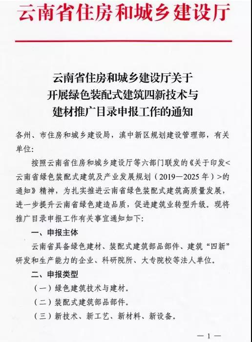 2020年3月17日,云南省住房和城鄉(xiāng)建設(shè)廳關(guān)于印發(fā)《開(kāi)展綠色裝配式建筑四新技術(shù)與建材推廣目錄申報(bào)工作》的通知,內(nèi)容強(qiáng)調(diào):
